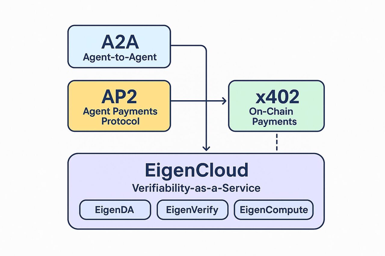 Trong chuỗi A2A → AP2 → x402, yếu tố còn thiếu là một lớp đảm bảo tính xác thực và minh bạch cho toàn bộ quy trình. EigenCloud – nền tảng “Verifiability-as-a-Service” của Eigen Labs – được sinh ra để đảm nhận vai trò đó.